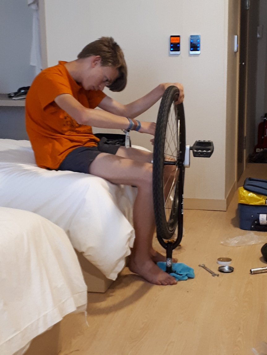Morgen is er de 10K. Jolan start dus in de snelste groep. Eerst rijden de snelle grote wielen, dan de trage grote wielen en om 9:30 uur is het aan de snelle 10K-rijders. We zijn benieuwd hoe het gaat lopen. Verwachte temperatuur is toch een dikke 30 graden.